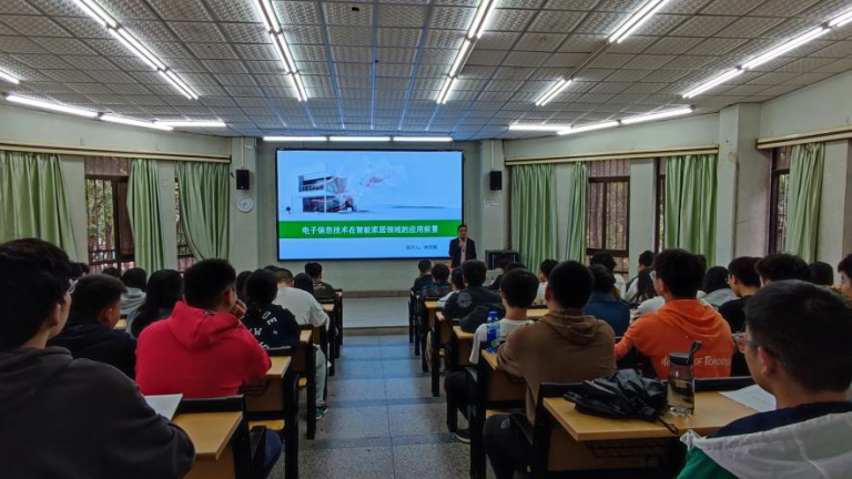 杨智源从智能家居行业现状入手,通过电子信息技术在智能家居解决方案中的应用,向同学们展示智能家居的用户体验并介绍典型总线系统技术。
