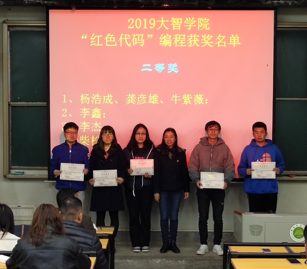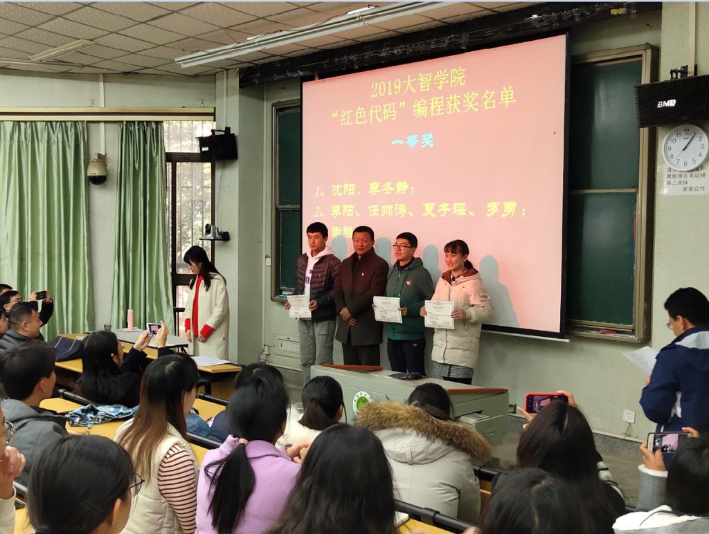 2019年12月12日,大数据与智能工程学院在信息楼D205举行“红色代码”编程比赛表彰大会。会议邀请了校党委委员郭正春同志和学院党委副书记(主持工作)张雁同志、学院党委委员吕丹桔同志担任颁奖嘉宾,为获奖党员颁奖。