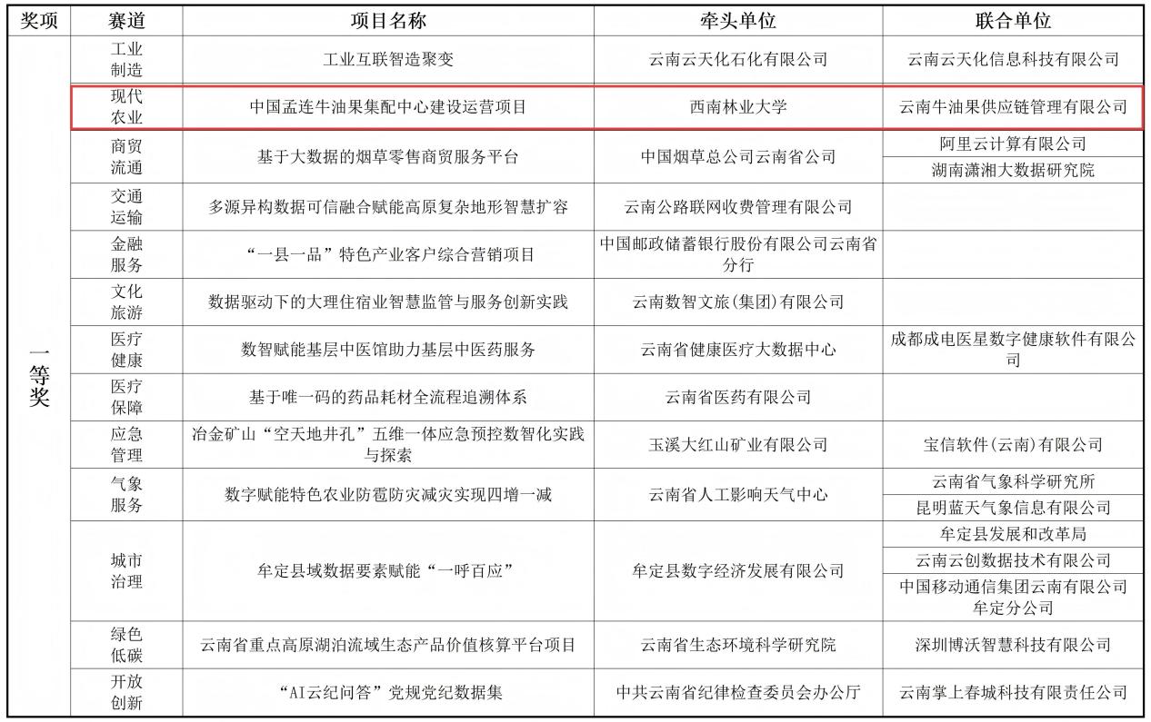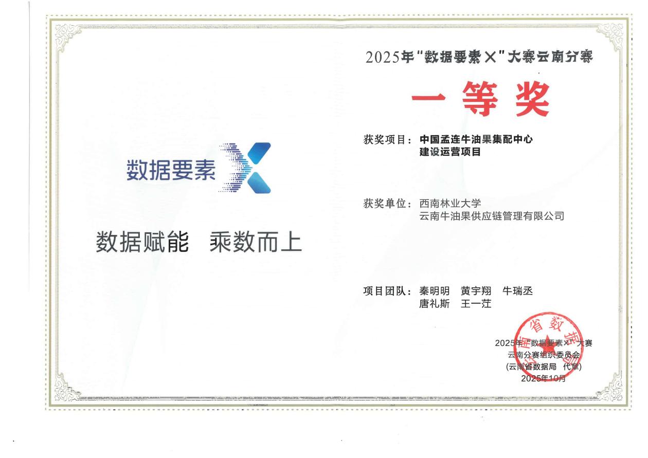 10月13日,由国家数据局、云南省人民政府指导,云南省数据局联合19个省级部门共同举办的2025年“数据要素×”大赛云南分赛在昆明隆重颁奖。我院教师携手云南牛油果供应链管理有限公司报送的“中国孟连牛油果集配中心建设运营项目”从全省642支参赛队伍中脱颖而出,荣获现代农业赛道一等奖,并将代表云南省出征全国总决赛。