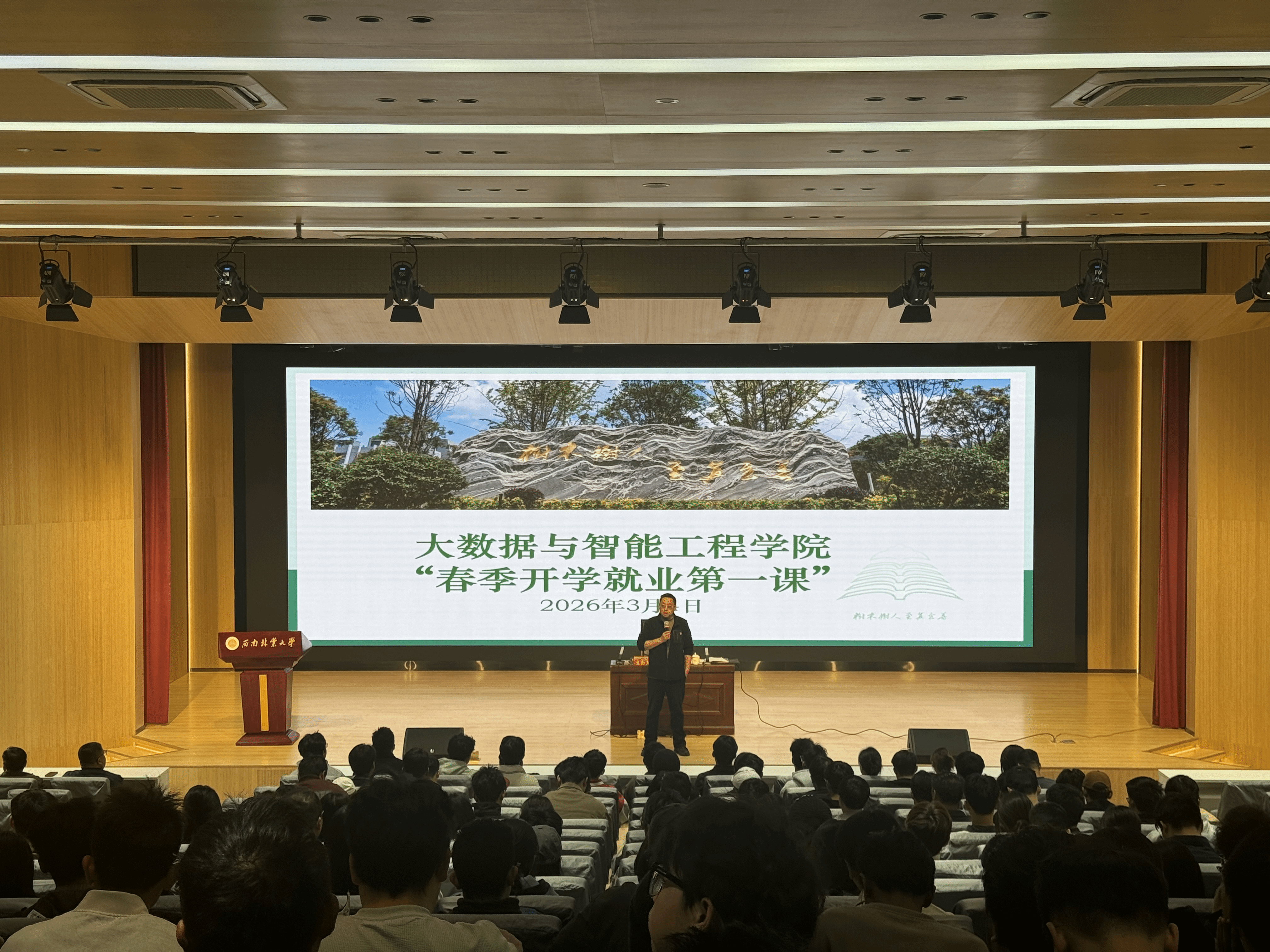 3月4日上午,大数据与智能工程学院2026年“春季开学就业第一课”在北图大报告厅顺利开展。学院党委书记李勤文为全体毕业生授课,学院学工办负责人、毕业班班主任、就业联络员及全体毕业生共同参会,会议由学院党委副书记李会朋主持。