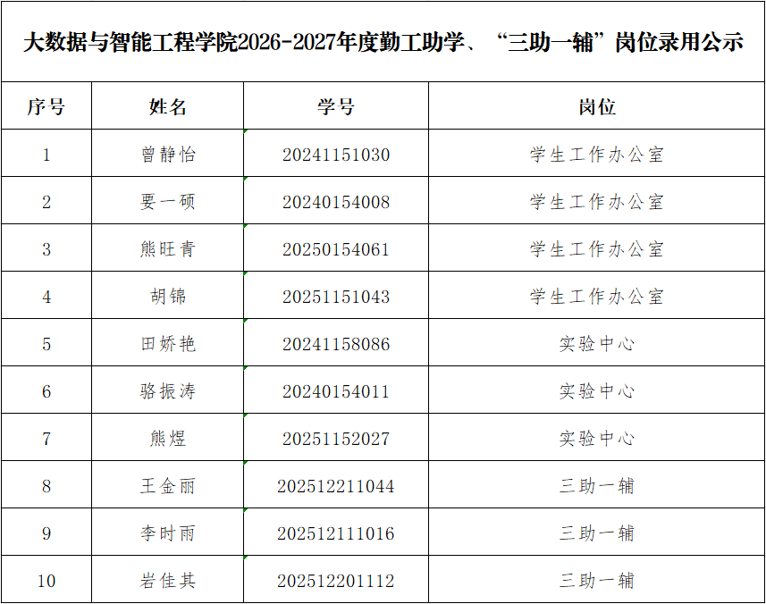 根据学校工作安排,经学生个人申请、资格审查及面试考核,现将大数据与智能工程学院2026-2027学年勤工助学、“三助一辅”岗位拟录用名单公示如下: 公示期为2026年3月19日18:00-3月20日18:00。如有异议,请在公示期内实名向学院学生工作办公室反映,逾期未反映视为无异议。 联系人:吴老师 联系电话:0871-63863493大数据与智能工程学院2026年3月19日